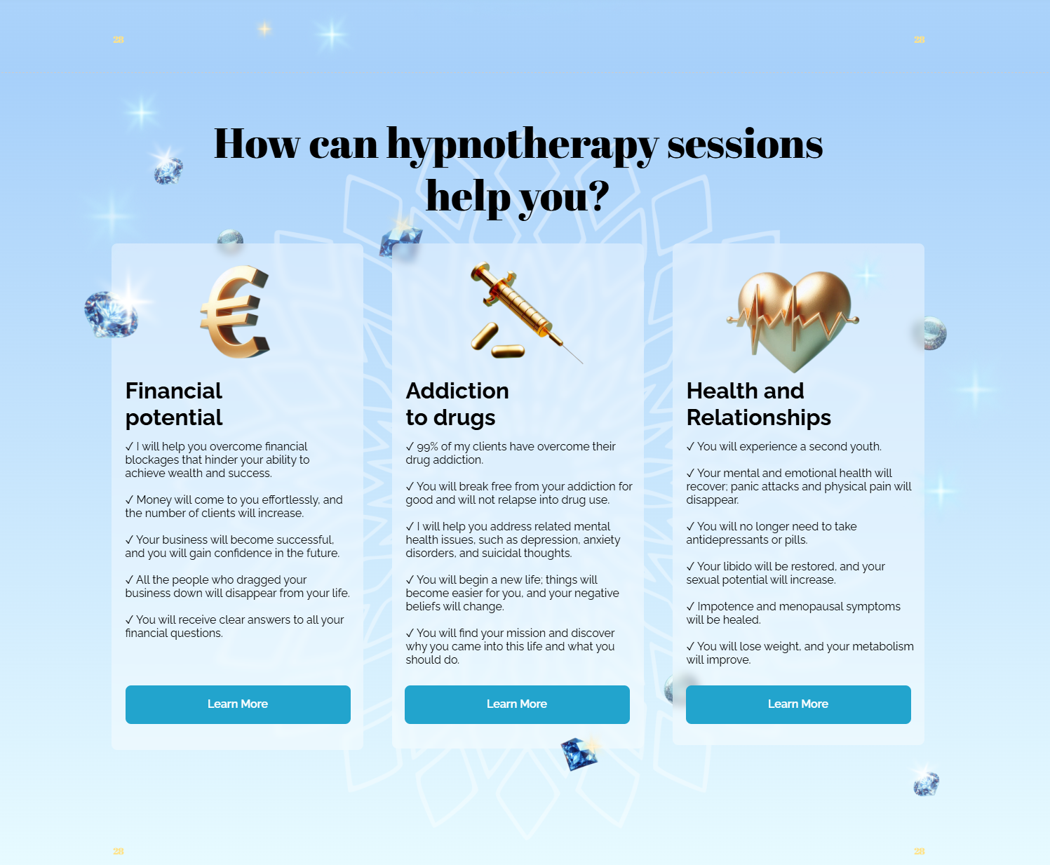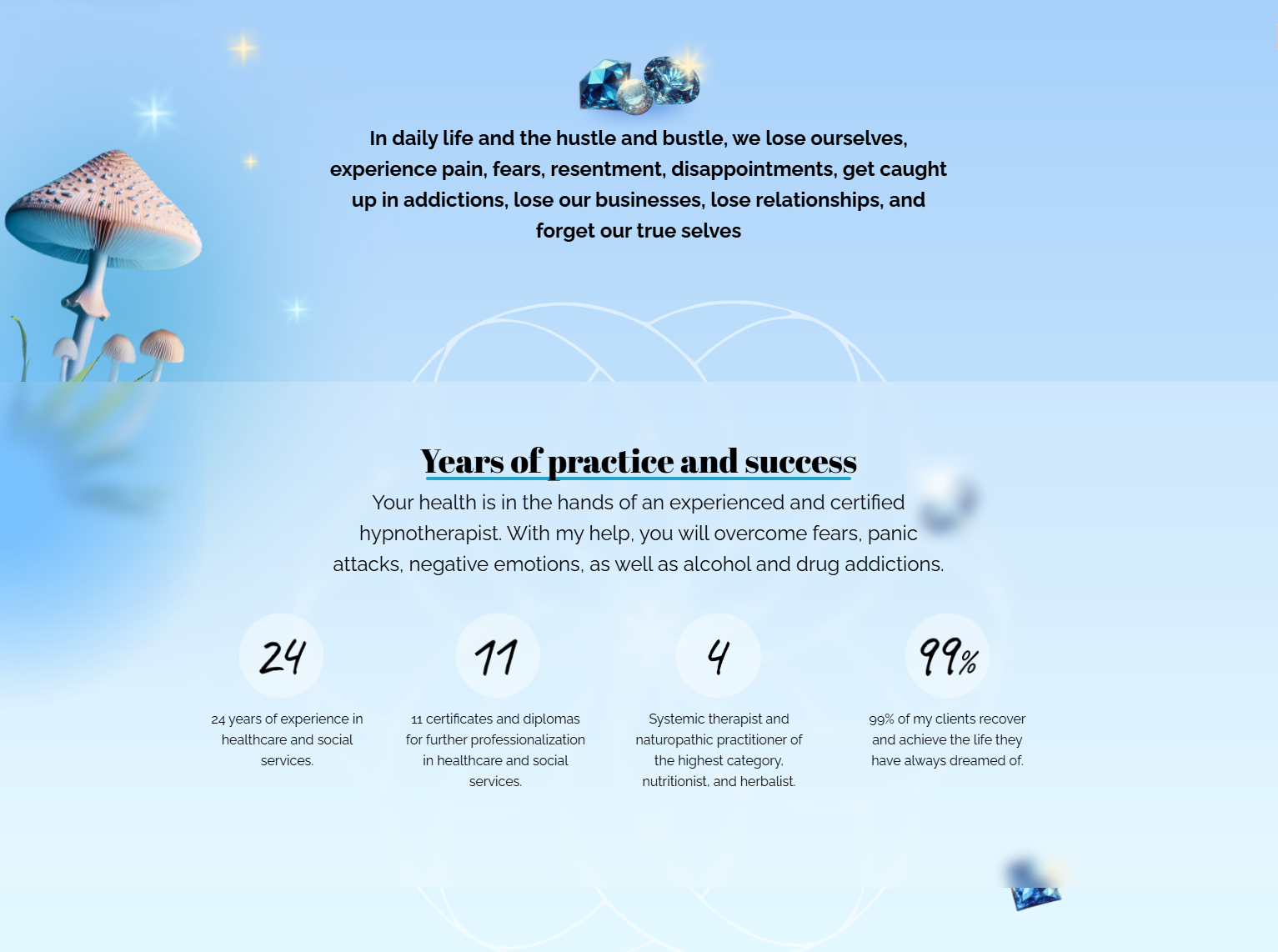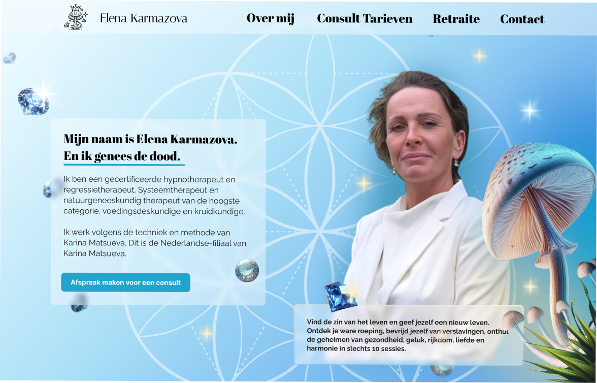 As a designer with expertise in business and marketing, I recently created a website for a private practitioner specializing in psychology, therapy, neuropractices, and redressology. The client envisioned a fantastical design inspired by a forest theme, incorporating mushrooms, flowers, diamonds, glowing elements, and subtle 3D features. The challenge was to strike a balance—creating an immersive jungle-like atmosphere while ensuring the site remained lightweight and fast-loading.